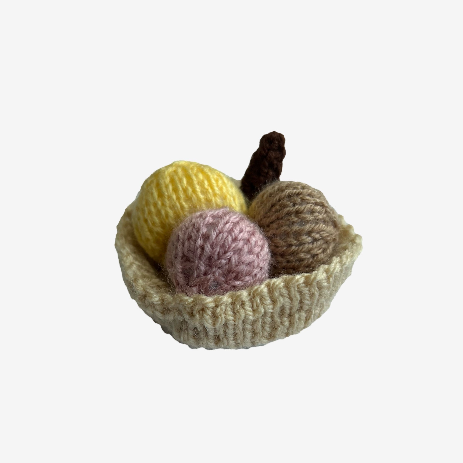 Eisbecher, gestrickt, bunt - ca. Ø 8 cm, Hohe (mit Schokoladenstäbchen) 5 cm, Waffelbecher hellbraun. Drei Eiskugeln:"Himbeere" altrosa, "Haselnuss" hellbraun und "Banane" (hellgelb) und das Schokoladenstäbchen ist aus dunkelbrauner Wolle.