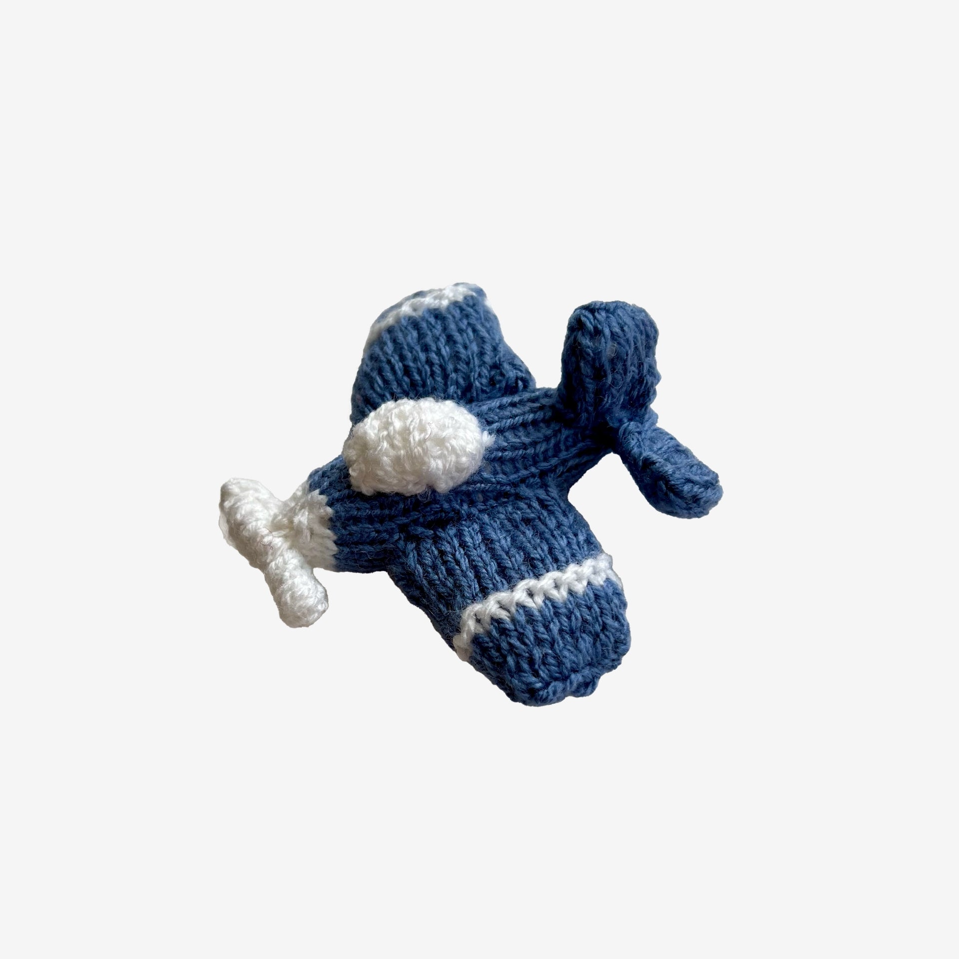 Flugzeug, gestrickt: Länge 10 cm (mit Propeller, Heck Seitenteil), Breite 11,5 cm Flugzeug (mit Tragflächen) Mit.blauer Wolle (Farbe "airforce") gefertigt! Ein weisses Cockpit 2,5 cm und einem Propeller 4 cm lang. Bei den Tragflächen ist ein Streifen weiss eingestrickt.