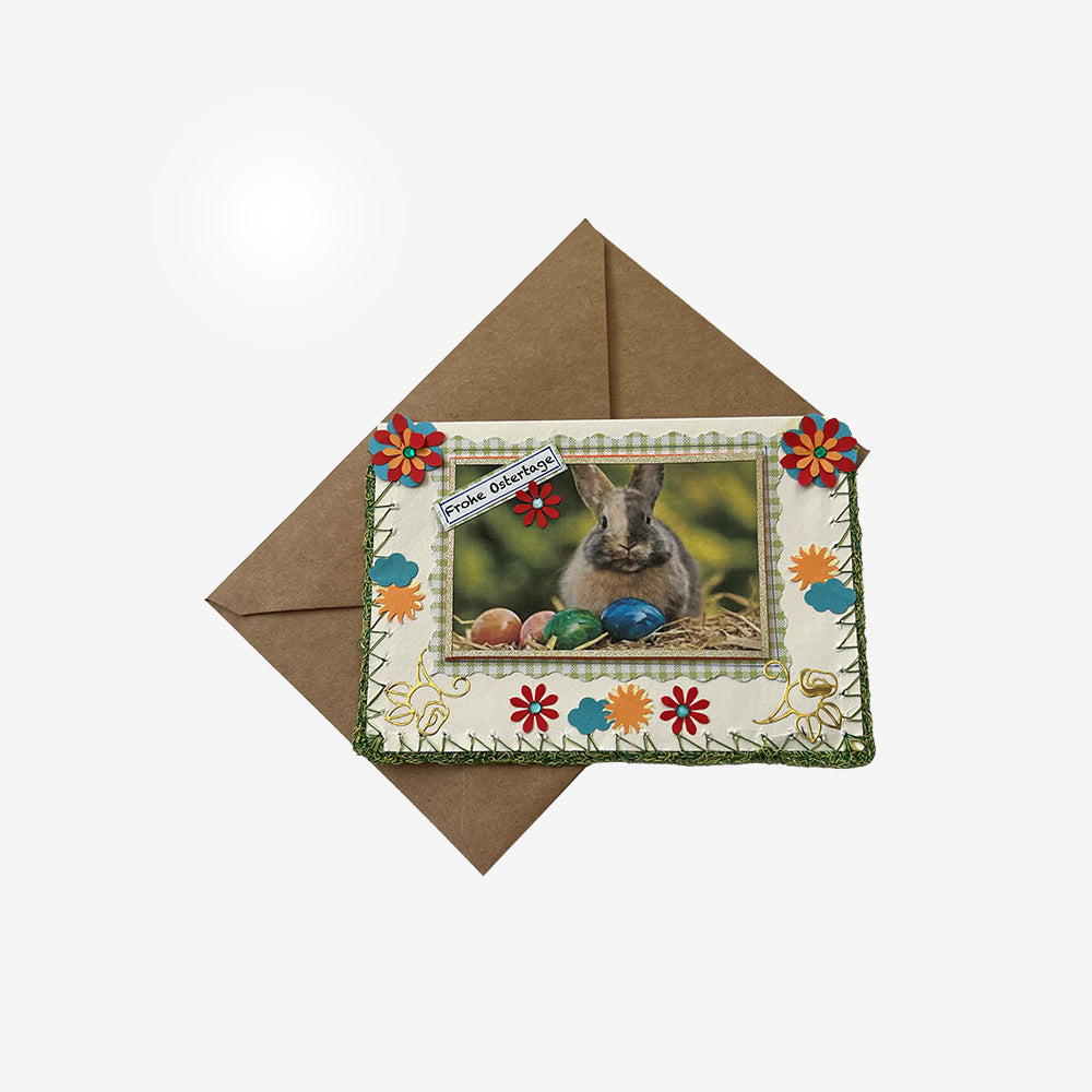 Bei der DIN A6 quer Doppelkarte creme ist die Vorderseite mit hellgrünem Garn umhäkelt. Darauf klebt ein 7,5 x 11 cm grünkarierter Motivkarton, der mit Zierrandschere ausgeschnitten ist. Auf diesem befindet sich ein 6,5 x 10 cm oranges Moosgummi-Stück, worauf ein ausgedrucktes Häschenfoto klebt, welches mit Gold-Glitzer-Streifen umrundet ist. Die Karte ist mit dem Motivstanzer ausgedruckten kleinere Blumen/Blüten mit Dekosteinchen in bunten Farben und Wölkchen mit Sonne verziert. Zudem sind in den unteren beiden Ecken 2 goldene Tulpensticker. Ein Schildchen "Frohe Ostertage" und ein kleines Blümchen mit Dekosteinchen klebt oben links etwas über das Häschenfoto.