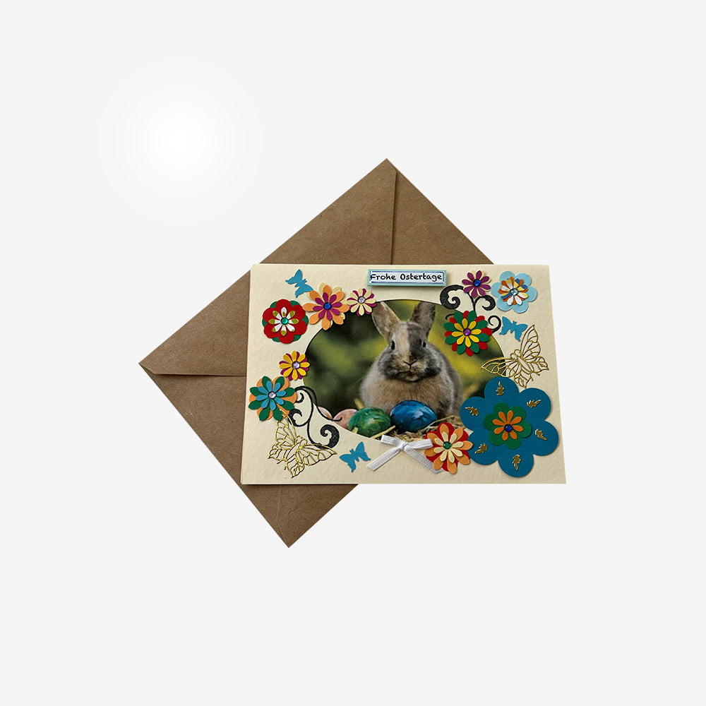 Bei der DIN A6 quer Passepartout-Doppelkarte creme mit ovalem Ausschnitt ist dahinter ein Häschenfoto befestigt und mit dem gleichfarbigen Tonkarton zugeklebt. Die Karte ist mit dem Motivstanzer ausgedruckten kleineren Blumen/Blüten in bunten Farben, Schmetterlingen sowie einer grossen Stanzblume in türkisblau und Dekosteinchen verziert. Zudem sind 2 goldene Schmetterlingsticker angebracht sowie dazwischen eine gestempelte Ranke. Ein Schildchen "Frohe Ostertage" und ein weisses Schleifchen klebt in der unteren Hälfte