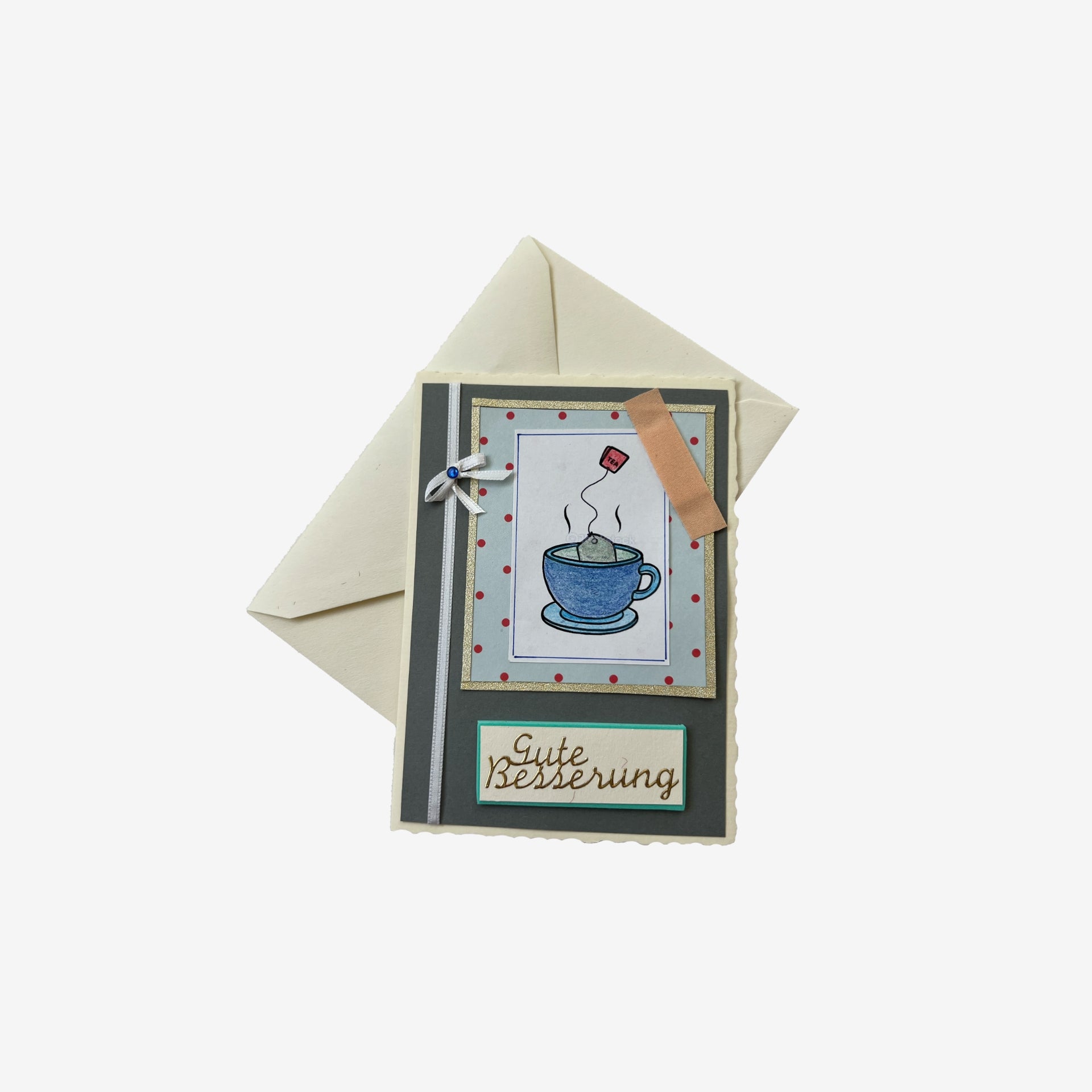 Auf der DIN A6 Doppelkarte mit Büttenrand elfenbein klebt ein graues 10 x 13,5 cm Tonpapier Rechteck. Darauf ist ein 7 x 8,5 cm Quadrat vom hellblauen Motivkarton mit roten Punkten, der Rand ist mit dünnen Streifen vom Gold-Glitzer-Klebebogen eingefasst. Ein 4 mm weisses Satinband ist seitlich links auf dem grauen Rechteck angebracht auf dem ein blaues Dekosteinchen klebt. Darauf befindet sich ein ausgedrucktes Bild Teetasse mit Beutel, welches mit Buntstiften leicht koloriert ist. In der Ecke rechts oben klebt ein Stück Pflaster. Im unteren Teil befindet sich ein ca. 2,5 x 6,5 cm rotes Moosgummi-Stück, mit einem rechteckigen beigen Tonkarton Stück und dem Schriftzug "Gute Besserung". Auf der Innenseite der Karte ist ein 2 x 9 cm Streifen aus dem Motivkarton angeklebt, in den ein Teebeutel der Wahl hineingesteckt werden kann.
