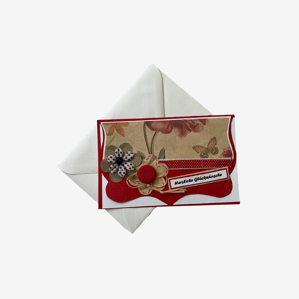 Aus einem roten Prägekarton mit Blumen ist ein 10,5 x 22 cm grosses Rechteck zugeschnitten. Dieses ist in der Mitte zu einer DIN A6 Doppelkarte gefaltet und auf der Vorderseite etwas abgerundet bzw. mit einer Spitze versehen. Darauf klebt auf einem weisses Papier ein gemustertes beige/rotes Motivpapier. Dazu befindet sich in der Mitte ein rotgepunktet Satinband. In der unteren Hälfe sind zwei grössere Blumen aus Stanzblumen aus obigem Motivpapier, Stoffblüte, Knopf, Perlen und Bast angefertigt und links unten angebracht. Ein weisses Textschild "Herzliche Glückwünsche" auf einem Stück Motiv- u. Prägepapier klebt auf der anderen Seite.