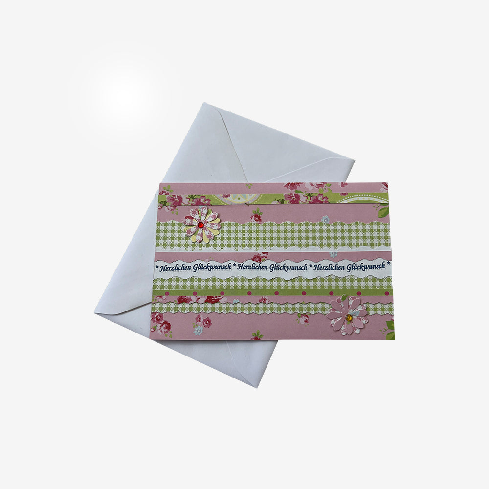 Aus einem 15 x 21 cm zweiseitig gemusterten (rosa geblümten und rosa weiss karierten) Tonkarton ist eine Doppekarte DIN A6 gefaltet. Auf der blumigen Vorderseite sind diverse dünnere und dickere Streifen von karierten und gepunkteten Motivkartons mit der Zierrandschere ausgeschnitten. In der Mitte ist ein gedrucktes ca. 1,3 cm weisses Papierband mit "Herzlichen Glückwunsch". Darauf befinden sich zwei Stanzblüten mit Glassteinchen in den auf der Karte verwendeten Motivkartons.