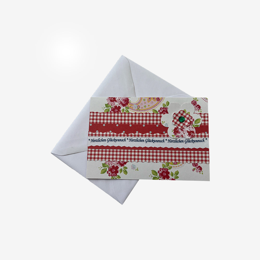 Aus einem 15 x 21 cm zweiseitig gemusterten (rot geblümten und blau gepunkten) Tonkarton ist eine Doppekarte DIN A6 gefaltet. Auf der blumigen Vorderseite sind diverse dünnere und dickere Streifen von karierten und gepunkteten Motivkartons mit der Zierrandschere ausgeschnitten. In der Mitte ist ein gedrucktes ca. 1,3 cm weisses Papierband mit "Herzlichen Glückwunsch". Darauf befindet sich eine grosse Stanzblüte mit Glasstein in den auf der Karte verwendeten Motivkartons.