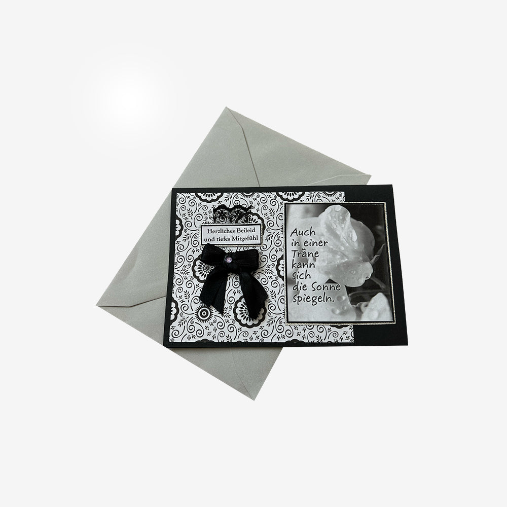 Aus einem 14,5 x 21 cm schwarzen Tonkarton ist eine DIN A6 quer Doppelkarte gefaltet. Ein 9 x 111 cm schwarzweiss gemustertes Motivpapier klebt linksbündig darauf. Auf der rechten Seite ist ein ausgedrucktes schwarzweiss Bild mit einer "Rose und Spruch: Auch in einer Träne kann sich die Sonne spiegeln" auf einem schwarzen Tonkarton. Dieses befindet sich auf einem 6,5 x 7,5 cm silbernen Glitzerpapier. Das weisse Textschild "Herzliches Beileid und tiefes Mitgefühl" klebt auf einem auf einem schwarzem 1,5 x 4 cm grossen Tonpapier. Auch dieses hat den gleichen Hintergrund wie das Bild. Zudem steckt ein Stück schwarzer Spitze dahinter. Darunter befindet sich eine aus schwarzem Satinband gebundene Masche mit einem Glassteinchen.