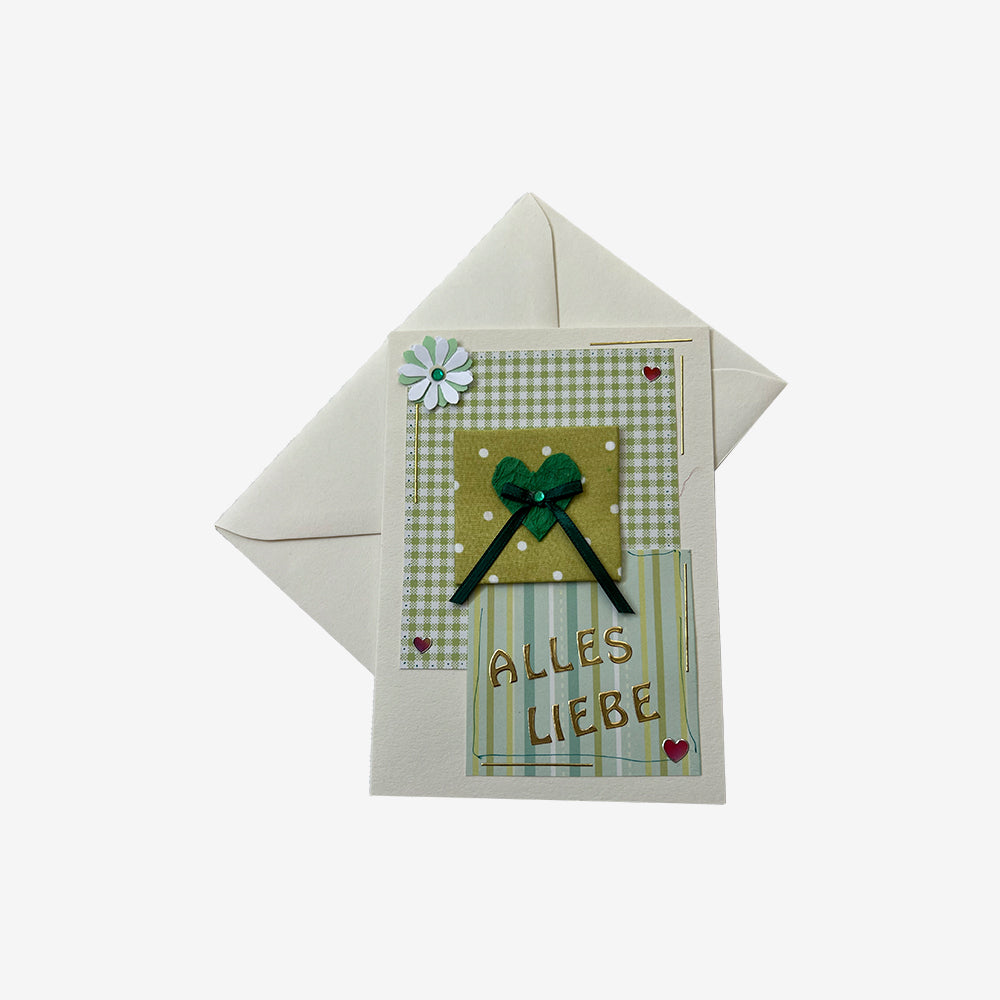 Auf diesem klebt ein kleines Herz aus dunkelgrünem Moonrock Papier mit einer grünen kleinen Satinschleife, weisse und hellgrüne Stanzblumen, Mini-Herzchen und Goldsticker "Alles Liebe".