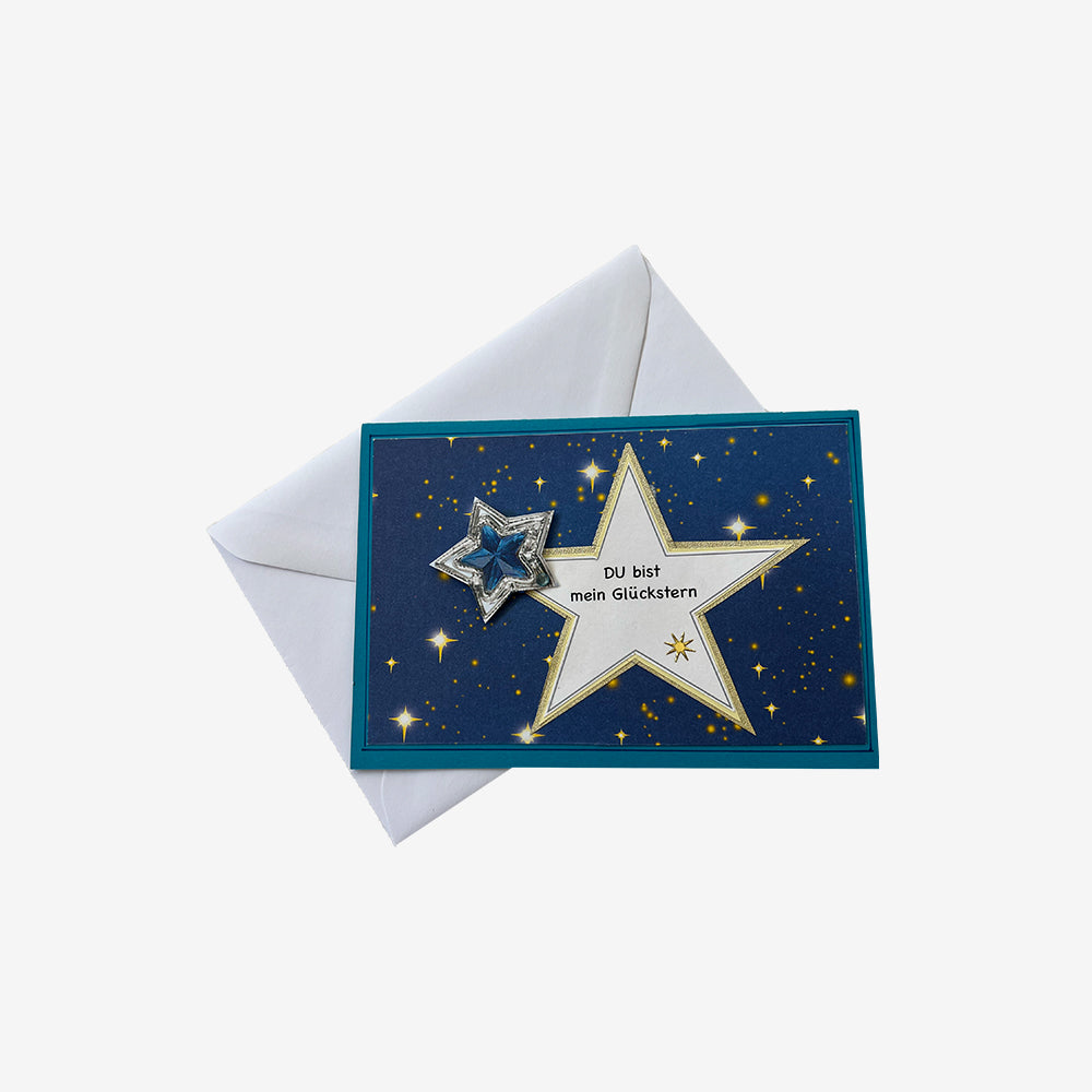 Aus türkisem Tonkarton eine quer Doppelkarte DIN A6 gefaltet. Darauf klebt ein 9 x 14 cm grosses Rechteck aus blauem Motivkarton mit Goldsternen. Aus Gold-Glitzer-Klebebogen ist ein 8 x 8 cm grossen Stern ausgeschnitten und ein etwas kleinerer weisser Stern aus Tonpapier mit Aufdruck "DU bist mein Glückstern" aufgeklebt. Der kleine 3D-Stern ist von einem Stern-Motivpapier ausgeschnitten, mit Moosgummi hinterlegt und einem hellblauen Dekosteinchen verziert.