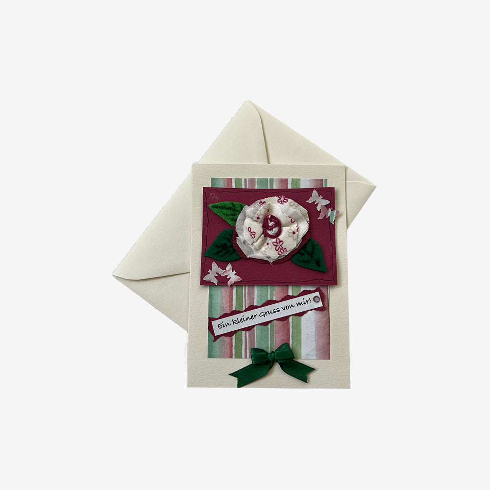 Auf einer DIN A6 Doppelkarte creme ist ein 8 x 12 cm grosses Rechteck aus gestreiften Motivpapier aufgeklebt. Ein kleineres 6,5 x 9 cm grosses Stück aus dunkelrotem Tonkarton klebt auf der oberen Kartehälfte. Verziert ist dieses mit einer Stoffrose und drei Blättchen aus dünnem hell- u. dunkelgrünem Filz. Vier Schmetterlinge aus dem gestreiften Motivpapier sind mit dem Motivlocher ausgestanzt. Je zwei sind auf der rechts oberen und links unteren Ecke. Eine grüne Schleife aus Satinband dient als Zierde. Auf dem mit der Zierrandschere aus dunkelrotem Tonkarton geschnittenen Textstreifen ein weisses Papier mit dem Aufdruck " Ein kleiner Gruss von mir" mit Ziersteinchen..