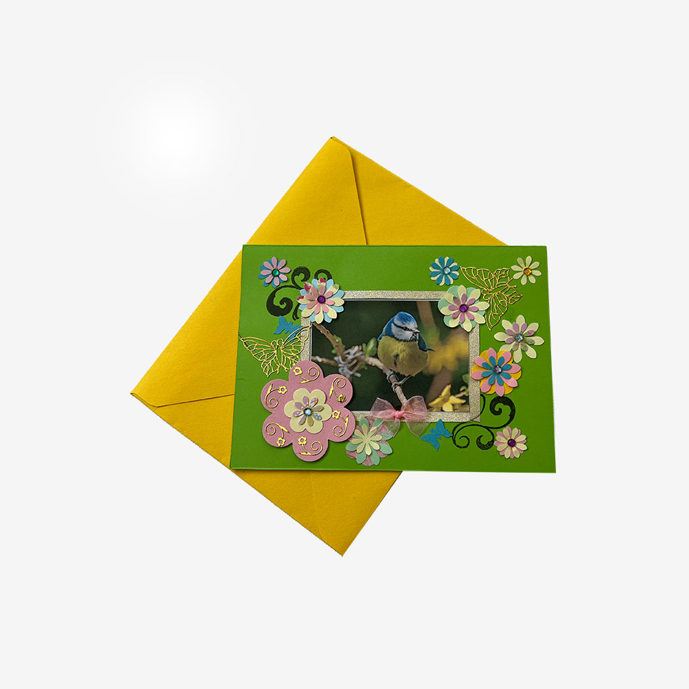 Bei der DIN A6 quer Passepartout-Doppelkarte mit rechteckigem Ausschnitt ist ein 5,5 x 8 cm ausgedrucktes Blaumeisenfoto, welches mit Gold-Glitzer-Streifen umrundet ist. Die Karte ist mit dem Motivstanzer ausgedruckten kleineren und grösseren Blumen/Blüten mit Dekosteinchen in pastelligen Farben sowie kleinen blauen Schmetterlingen verziert. Zudem sind in den oberen und unteren Ecken 2 Ranken aufgedruckt und mit 2 goldenen Schmetterlingstickern verziert. Eine rosa kleine Chiffonschleife klebt in der Mitte.