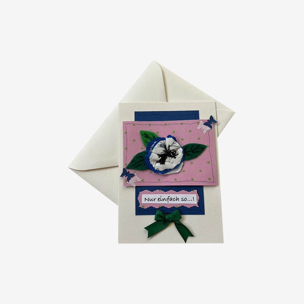 Auf einer DIN A6 Doppelkarte creme ist ein 7 x 11 cm grosses Rechteck aus dunkelblauem Tonpapier aufgeklebt. Ein kleineres 7 x 9,6 cm grosses Stück aus rosa Tonkarton mit Tupfen klebt auf der oberen Kartehälfte. Verziert ist dieses mit einer Stoffrose und drei Blättchen aus dünnem hell- u. dunkelgrünem Filz. Vier Schmetterlinge aus dem dunkelblauen und einem weissem Tonpapier sind mit dem Motivlocher ausgestanzt. Zwei von jeder Farbe sind auf die rechts obere und links untere Ecke geklebt. Eine grüne Schleife aus Satinband dient als Zierde. Auf dem mit der Zierrandschere aus getupften Tonkarton geschnittenen Textstreifen ein weisses Papier mit dem Aufdruck "Nur einfach so...!".