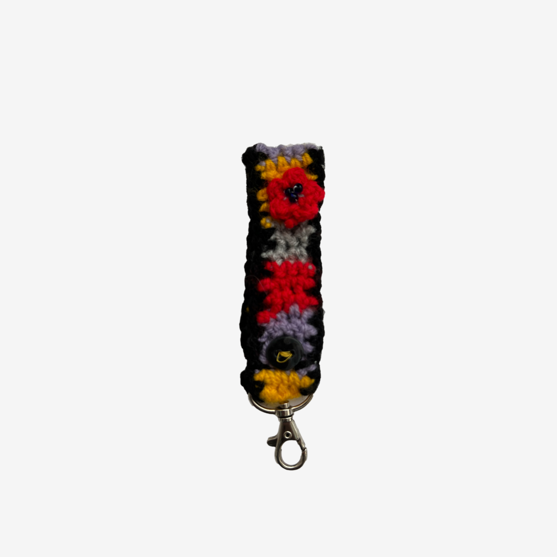 Das kurze Schlüsselband ist mit den Wollfarben flieder, rot, gelb. und grau abwechslungsweise in kleinen Kästchen mit fM gehäkelt und mit schwarzer Wolle umrundet. Der Karabiner (2,5 cm) wurde am Schluss eingenäht. 1 rotes Blümchen mit drei blauen Roncailles sowie ein Fimoknopf zieren das 11 cm lange Band.