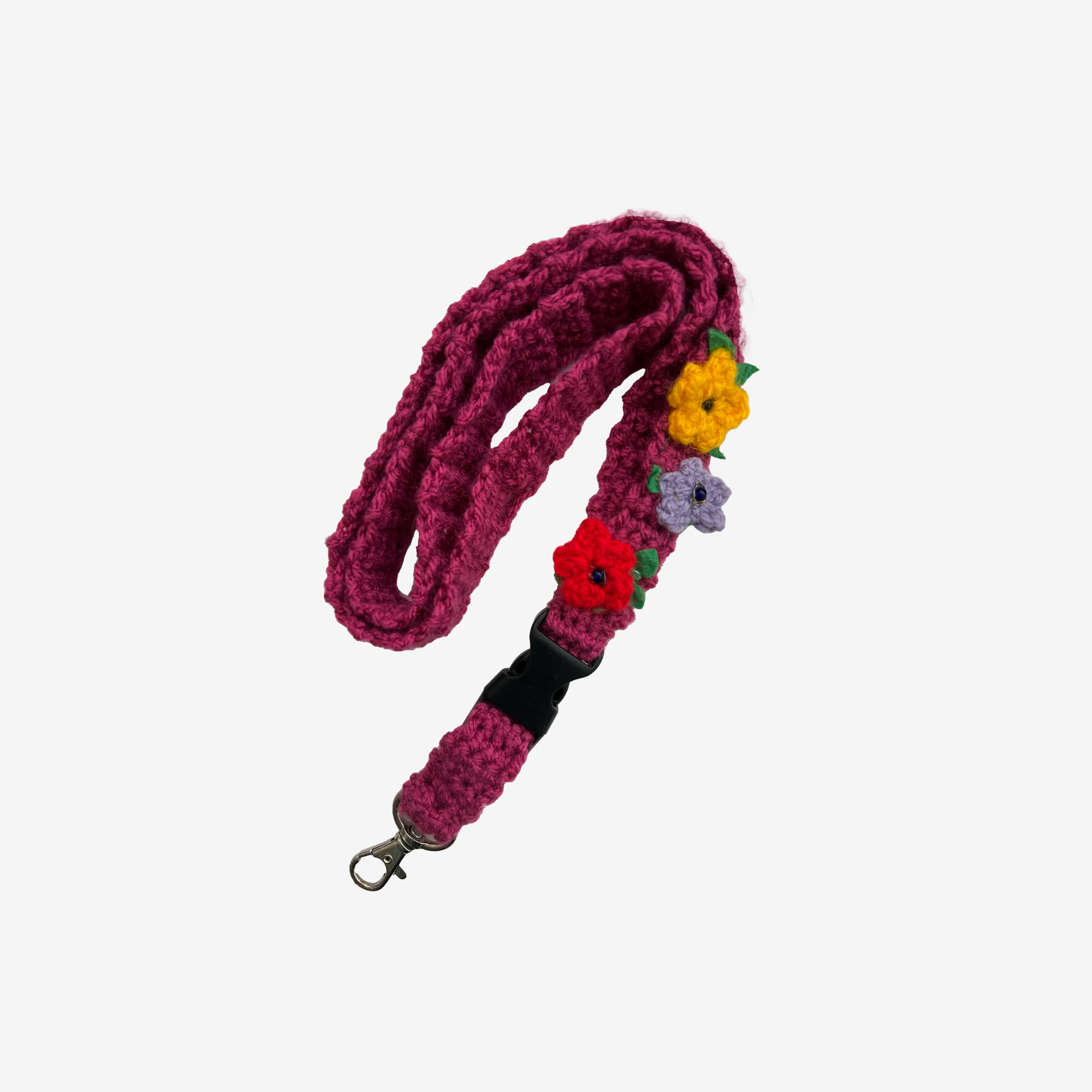Das 45 cm lange Schlüsselband mit Steckverschluss und Karabiner (2,5 cm) ist in der Wollfarbe beere gehäkelt. Zur Zierde sind drei Mini-Blümchen in rot, flieder und gelb mit mittig je einer schwarzen Roncailles aufgenäht die grüne Blättchen aus Moonrock Papier angebracht.